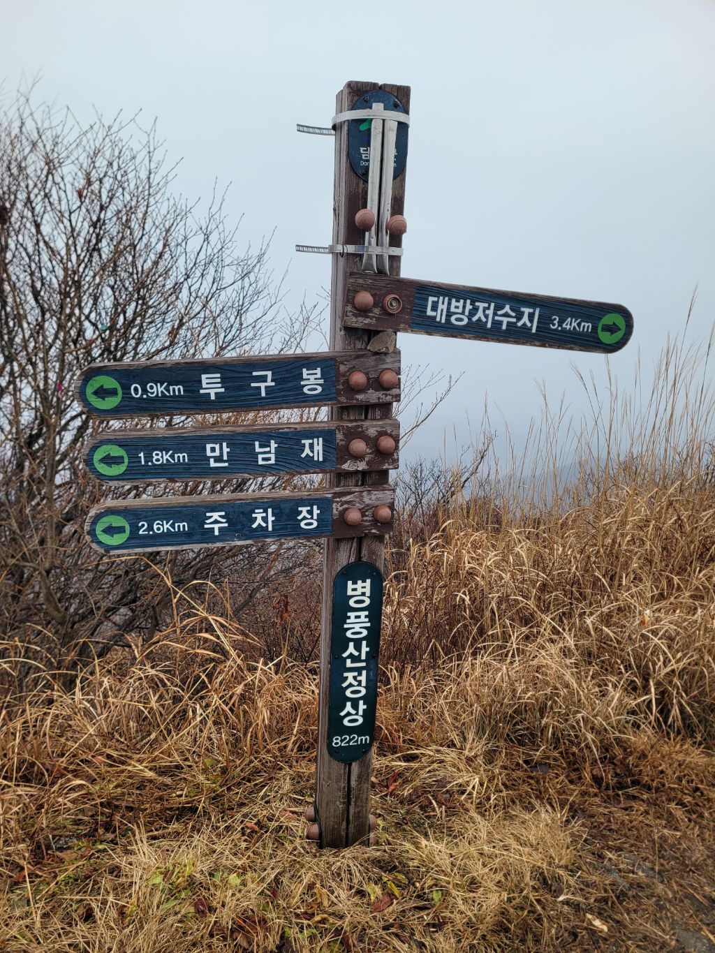 - 2025년 12월 13일(토) 한토. 대방지-천자봉-병풍산-투구봉-만남재-삼인산-삼방골 주차장 코스. 산행거리 10.5km. 산행시간 4시간 소요.